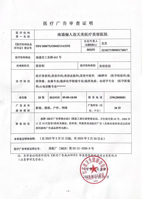 南通儷人連天美醫(yī)療美容醫(yī)院是與著名的醫(yī)療美容集團合作建立的醫(yī)院,醫(yī)院提供高品質的醫(yī)療美容服務。2008年,南通儷人連天美醫(yī)療美容醫(yī)院落戶南通,成為由南通衛(wèi)生局審批的專業(yè)醫(yī)療美容醫(yī)院。南通儷人連天美醫(yī)療美容醫(yī)院,特別設有專業(yè)的整形美容科、皮膚美容科和微創(chuàng)美容科三大科室,致力于為廣大求美者提供全方位的醫(yī)療美容服務。南通儷人連天美醫(yī)療美容醫(yī)院為求美者建立個人終生美麗檔案,一對一進行細致服務。 11年來,南通儷人連天美醫(yī)療美容醫(yī)院,不斷引進先進設備,不斷完善醫(yī)美技術,一批優(yōu)秀、專業(yè)而穩(wěn)定的醫(yī)生團隊,為無數(shù)求美者鑄就美麗夢想。